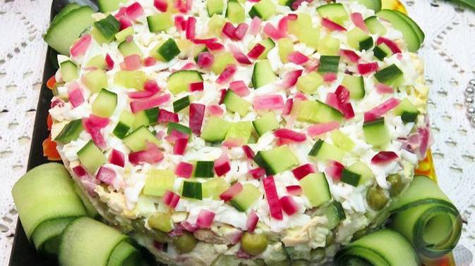 Все самые интересные вкусы собрались в этом праздничном салате. #СалатСКурицей #СалатСОгурцами #СалатСЛуком #СалатСГорошком