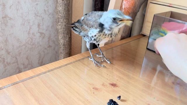 Домашний дрозд ест шелковицу
