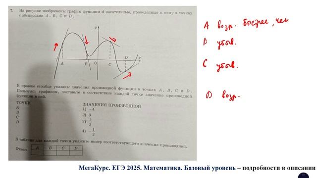 ЕГЭ. Математика. Базовый уровень Задание 7. На рисунке изображены график функции и касательные, проведенные к нему в точках с абсциссами A, B, C и D. В правом столбце указаны значения производной функции в точках A, B, C, D. Пользуясь графиком, поставьте в соответствие каждой точке значение производной функции в ней. В таблице для каждой точки укажите номер соответствующего значения производной. Курс по всем заданиям 1 - 21 базового уровня ЕГЭ по математике: https://stepik.org/a/174709 Группа ВК: https://vk.com/secretroom2023 #егэ #математика #база