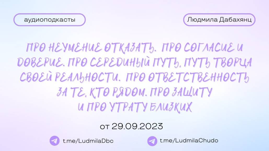 Аудиоподкаст от 29.09.23 На тему «Про неумение отказать. Про способность сказать НЕТ. Про согласие и доверие. Про серединный путь, путь Творца своей реальности. Про ответственность за те, кто рядом. Про защиту. И про утрату близких.» ТЫ МОЖЕШЬ ПРИЙТИ СО СВОИМ ЗАПРОСОМ! ✓ Обязательно поставь лайк ✓ Подпишись на канал ✓ И поделись с близкими Это будет вашим балансом за движение и получение энергии. Если есть желание создать баланс брать-давать... приму от всего сердца с благословением (донейшн). С Огромной Любовью, Дабахянц Людмила ✨ Telegram: https://t.me/ludmiladbc ✨ Канал в telegram “Я ЕСТЬ ТО, ЧТО Я ЕСТЬ”: https://t.me/LudmilaChudo ✨Онлайн-школа: https://ludmilachudo.skillspace.ru/school