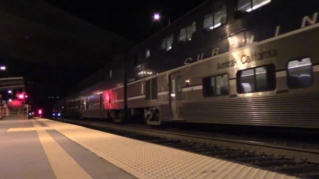 Тепловоз тянет двухэтажный пассажирский поезд. Скоростное движение в Америке