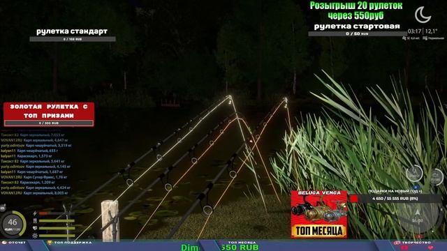 Поддержка донатом https://www.donationalerts.com/r/kalyamba11 Альтернативный донат https://new.donatepay.ru/@1032463 ТОП МЕСЯЦА ПОЛУЧАЕТ ЛЮБУЮ ВЕНГУ ИЗ МАГАЗИНА Если стрим лагает,смотри стрим на трово https://trovo.live/s/Kalyamba_na_Ribalke Мой ВК - https://vk.com/kalyantv НИК в игре kalyan11 НАШ ДИСКОРД СЕРВЕР https://discord.gg/mSbnTJK8TB Заказ водоема на 1 час - 500р ( весь стрим 2500р ) Модерка на канале 1200р ( каждая следующая на 100р больше) Озвучка доната на 40р,50р,100р,200р,300р,500р,1000р ✅Призы в рулетке "ЗОЛОТАЯ" ✔ ЗОЛОТО ✔ ПРЕМ ✔ КАТУШКИ РАПТОР 40, АЗИМУТ 10000, СИЛЬВЕР 80, ТАЙГА с 30 ✔ ПАЛКИ ПИЛКЕРНАЯ, ДОНКА МОРСКИЕ, ✔ РОД ПОД, СТУЛЬЯ ✅Призы в рулетке СТАНДАРТ : ✔ катушка "РАПТОР 40" ✔ катушка "АЗИМУТ 10000" ✔ катушка "ТАЙГА С30, С40," ✔ катушки 60 для медного ( ЭВИИ, НАТОРЫ, ГОЛДА, и тд) ✔ ПИЛКЕРНОЕ УДИЛИЩЕ КОРОЛЕВА ОКЕАНА ✔ Морское Донное удилище ✔ прем ( 3, 7, 30 дней) ✔ золото ( 1, 3, 5, 10, 20 ,50) ✔ билет на море ( 1, 3, 5 дней) ✔ голд наживка и др. ✅Призы в рулетке "СТАРТОВАЯ" ✔ катушка "silver80" ✔ катушка "БЕЛЫЙ КАЛИБР" ✔ катушка "Черный калибр" ✔ катушка "Протон" ✔ катушка "Нарга 6000" ✔ Набор Фидерист и спинингист ✔ Карповик Фортуна ✔ фидерные удилища ✔ прем, золото, алкашка, наживки и тд P.s Рулетка это не казино, а награда за поддержку стримера. Вечный ТОП ПОДДЕРЖКИ (11.05.2024) 1. Dimon_pokemonchik 119 784 2. Interceptor 75 508 3. Skreb79 71 261 4. une personne 68 619 5. Нарвал77 31 550