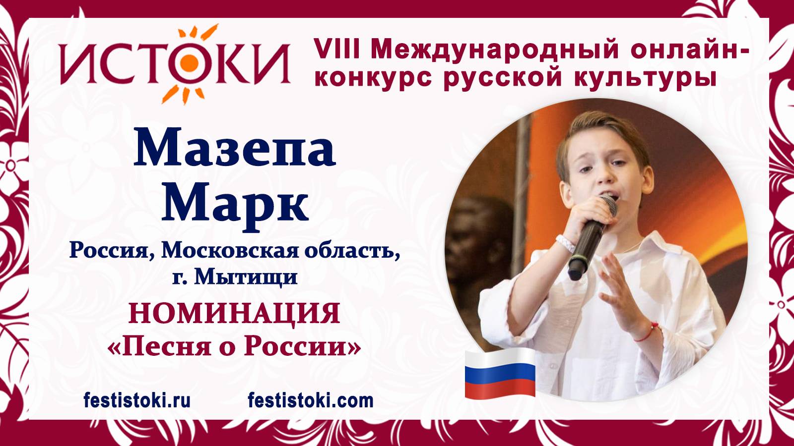 Участник VIII Международного онлайн-конкурса русской культуры "Истоки". Номинация "Песня о России". Песня "Русская душа". Сл. и муз. С.Новожилова. Сайт: festistoki.ru / festistoki.com E-mail: festistoki@mail.ru