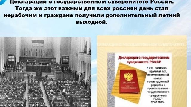 День независимости России важный государственный праздник Российской Федерации, отмечаемый ежегодно 12 июня. Сотрудники филиала № 38 предлагают тематическую видео-презентацию «12 июня день России», которая знакомит с историей праздника и его ролью в современном государстве.