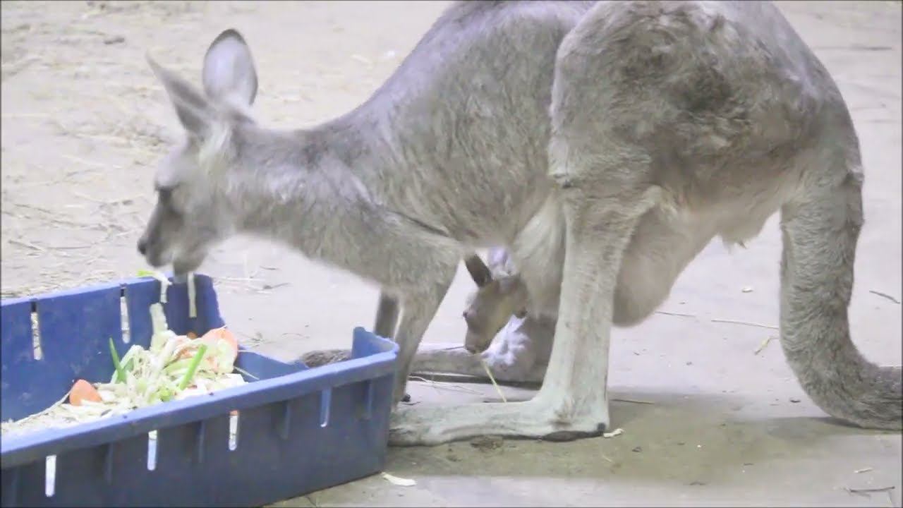 Большие серые кенгуру появились в коллекции Новосибирского зоопарка в 2008 году. Тогда из Израиля была доставлена первая пара. Позже были привезены ещё несколько больших серых кенгуру. В 2014 родился первый малыш. Вольеры кенгуру в зоопарке состоят из двух частей: тёплый павильон с выходом на улицу. Выходы на улицу им открывают ранней весной, когда ещё лежит снег, и закрывают поздней осенью. Уличные прогулки наши кенгуру продолжают вплоть до -10 градусов. Еще осенью стали заметны увеличившиеся сумки у самок больших серых кенгуру. И стало ясно, что в сумках у мам кенгуру есть малыши. С каждым месяцем сумки увеличивались, начали шевелиться, затем малыши стали показывать то хвост, то лапы, а иногда и выглядывать. Два детеныша достигли такого возраста, когда в маминой сумке еще не тесно, но уже хочется гулять самому. Один малыш впервые вышел из сумки в середине марта, другой – в начале апреля. В 2007 году из немецкого города Галле в Новосибирский зоопарк доставили группу из пяти кенгуру Беннетта. Их домом стал вольер в павильоне «Тропический мир». Первый малыш у наших кенгуру Беннетта появился на свет в 2008 году. Детёныши кенгуру появляются на свет настолько крохотными, что их путь от родового отверстия до сумки практически всегда не заметен со стороны. Вес новорожденного кенгурёнка всего 1 г. Вылезать из сумки детёныши кенгуру Беннетта начинают в возрасте 6-8 месяцев.