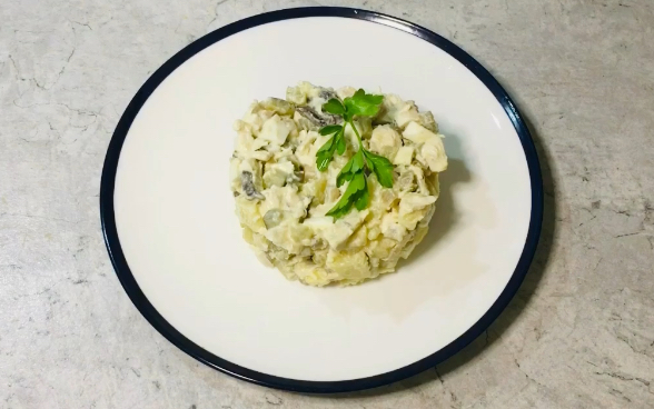 Вкусный и сытный салат с курицей, шампиньонами и маринованными огурцами