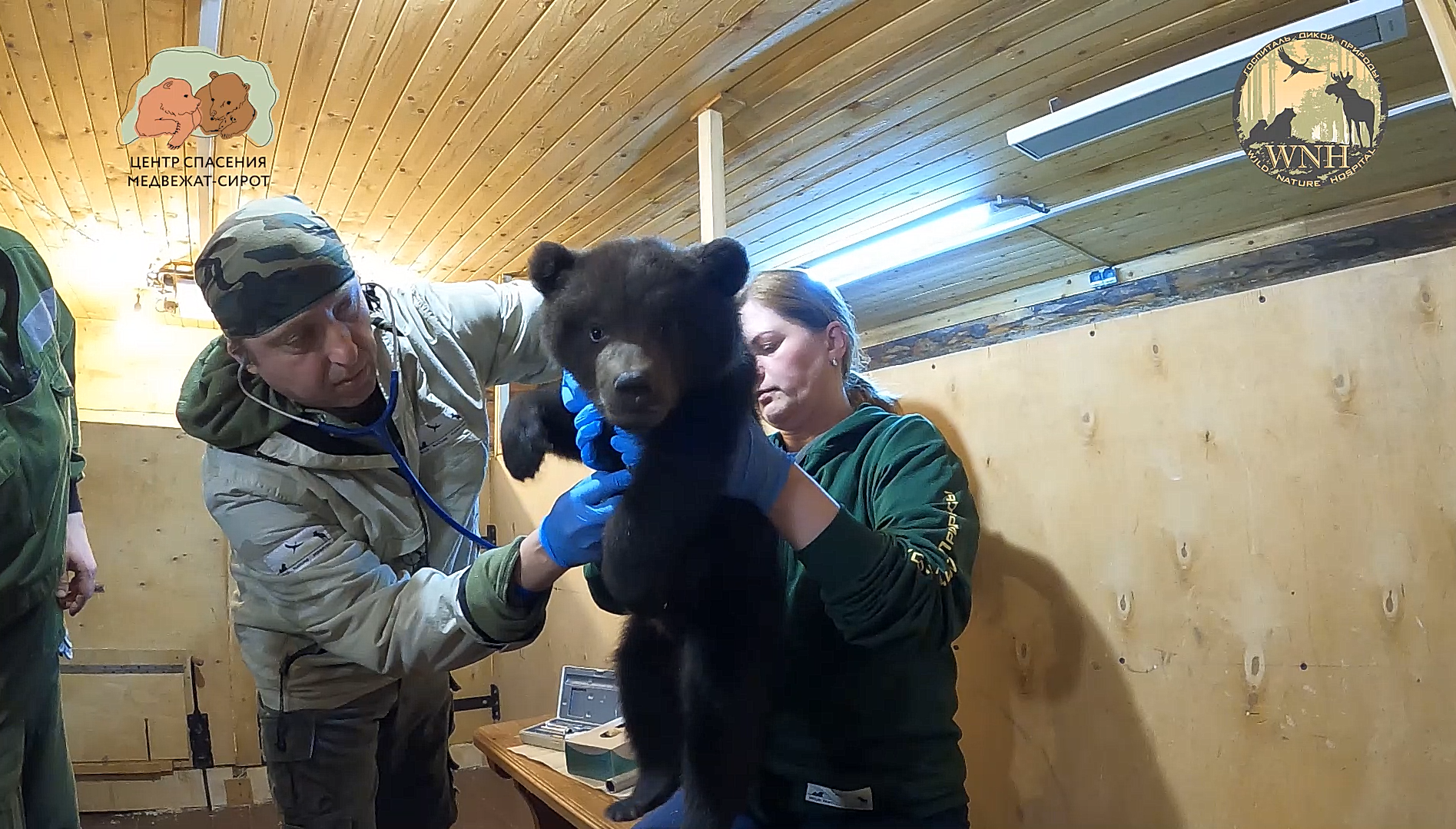 На прошлой неделе на плановое ветеринарное обследование медвежат к нам приехала команда Госпиталя Дикой Природы – Сергей Олегович Гершов и Надежда Петровна Яковенко. Медвежатам был проведен полный осмотр, включая: 6 ушей, 6 глаз, по 3 носа, животика и хвоста, 12 лап, 60 когтей, и, пока еще, небольшого количества, но очень острого «качества», зубов. Также все медвежата были тщательно «прослушаны» фонендоскопом на предмет выявления хрипов в легких, вакцинированы против бешенства и чипированы. Ветеринары оценили состояние медвежат, как стабильное, в соответствии с возрастом. Осмотр, конечное же, не вызвал у косолапых ровным счетом никакого восторга – маленькие медведи всячески пытались вырваться из рук и не дать себя осмотреть, сопровождая свое недовольство достаточно громкими «высказываниями». Поэтому Надежда призвала на помощь Василия, так как, несмотря на такую милую внешность, уже в этом возрасте медвежата очень сильные, верткие и хваткие. А в остальном все прошло благополучно, впрочем, как и всегда, ведь они были в надежных руках наших добрых друзей из Госпиталя Дикой Природы! Центр спасения медвежат-сирот: orphan-bear.org