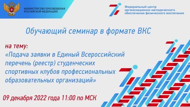 9 декабря 2022 года в 11:00 (по МСК) состоялся обучающий семинар в формате ВКС с руководителями студенческих спортивных клубов профессиональных образовательных организаций г. Москвы на тему: «Подача заявки в Единый Всероссийский перечень (реестр) студенческих спортивных клубов профессиональных образовательных организаций»