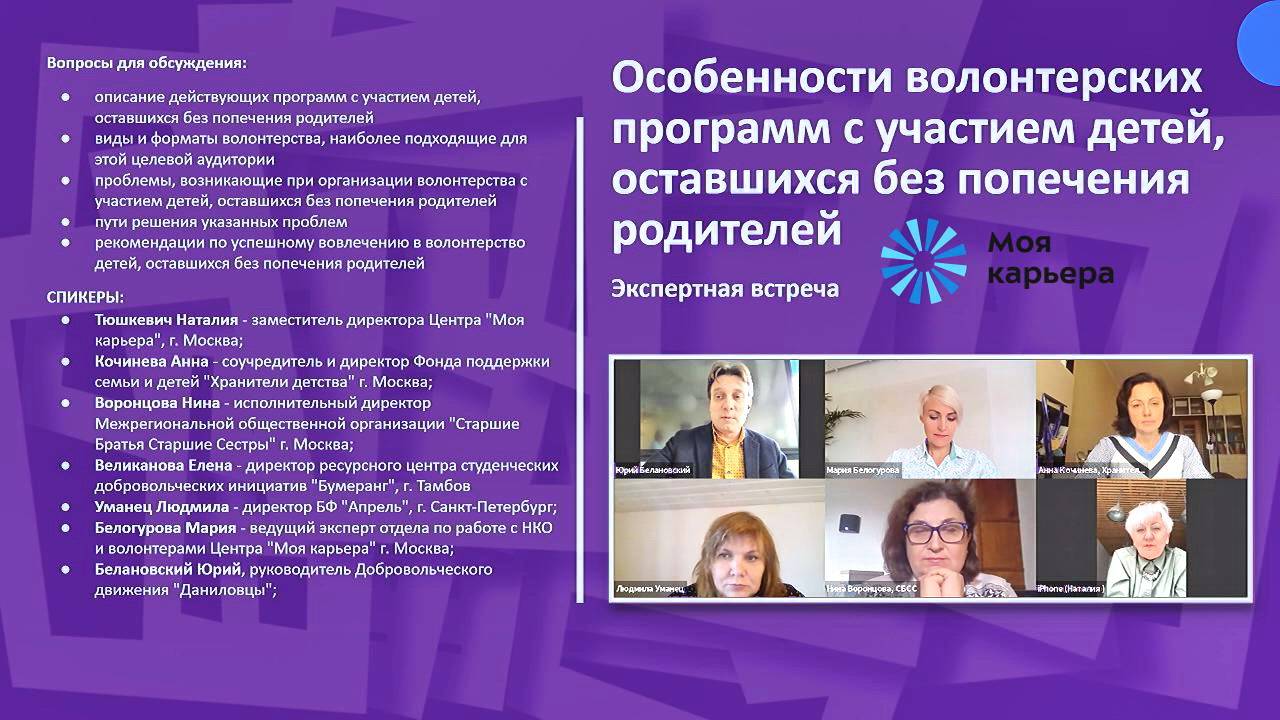 Цель экспертной встречи: выявление особенностей организации волонтерских программ с участием детей, оставшихся без попечения родителей. Вопросы для обсуждения: - описание действующих программ с участием детей, оставшихся без попечения родителей - виды и форматы волонтерства, наиболее подходящие для этой целевой аудитории - проблемы, возникающие при организации волонтерства с участием детей, оставшихся без попечения родителей - пути решения указанных проблем - рекомендации по успешному вовлечению в волонтерство детей, оставшихся без попечения родителей Участники Экспертной встречи: 02:07 Наталия Тюшкевич, заместитель директора Центра "Моя карьера", г. Москва; 08:50 Анна Кочинева, соучредитель и директор Фонда поддержки семьи и детей "Хранители детства" 28:49 Нина Воронцова, исполнительный директор Межрегиональной общественной организации "Старшие Братья Старшие Сестры" 45:40 Мария Белогурова, ведущий эксперт отдела по работе с НКО и волонтерами Центра "Моя карьера" Cкачать презентацию: https://disk.yandex.ru/i/Y9yGKvZ2CLONaQ 1:03:36 Людмила Уманец, директор БФ "Апрель", г. Санкт-Петербург 1:17:03 Вопросы, обсуждения, комментарии Ведущий: Белановский Юрий Сергеевич, председатель совета Союза волонтерских организаций и движений, руководитель Добровольческого движения "Даниловцы". Организатор: Центр "Моя карьера", г.Москва https://mycareer.moscow/#/applicant