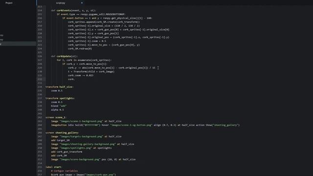 In this video we will make it possible to shoot cork bullets with the cork gun by clicking with the mouse and have these bullets travel to the destination of the mouse click while also scaling down to imitate the bullets moving away from us. »»» Documentation links ««« Sprites: https://www.renpy.org/doc/html/sprites.html restart_interaction(): https://www.renpy.org/doc/html/other.html#renpy.restart_interaction pygame events: https://www.pygame.org/docs/ref/event.html (the first yellow 'block' on that page has some of the name of events you can check for) If you feel something is unclear in the video, such as why we are coding something in a certain way, feel free to leave a comment below and I'll see if I can explain it a bit better. »»» Patreon ««« If you like this video and appreciate my work, you can support me on Patreon: https://www.patreon.com/ess_renpy_tutorials *** About this channel *** Welcome to my channel! I create mini-game tutorials for the Ren'Py visual novel engine for those of you who want to spice up your visual novels with some more advanced game-play mechanics. My tutorials usually mix Ren'Py's own scripting language together with Python, so it's good if you have some knowledge on how to use Python code as well. I don't have a specific upload schedule, but I try to get new videos out regularly. Thank you for watching my videos and I hope they are helpful! #renpy #tutorial #minigame