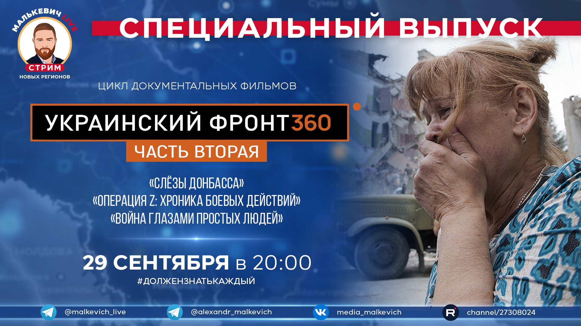 В рамках спецрубрики #ДолженЗнатьКаждый мы продолжаем знакомить вас с циклом документальных фильмов «Украинский фронт 360» [часть 2], созданным при поддержке Института развития интернета (ИРИ). (https://xn--h1aax.xn--p1ai/) ▪️ «Слёзы Донбасса». В этом фильме истории детей, чьи жизни навсегда изменил Украинский фронт: отнял всё, сделал их инвалидами или сиротами. Авторы фильма дают понять, что Украинский фронт нужно завершать любыми средствами, иначе неизвестно, сколько ещё Аллей ангелов придётся возвести на освобождённых территориях. ▪️ «Операция Z: хроника боевых действий». Этот фильм о военкорах. Они первыми оказываются на месте обстрелов, на месте ожесточённых боёв и на освобождённых территориях. Их глазами мы 8 лет смотрели на противостояние в Донбассе. Российские военные корреспонденты всегда в гуще событий. Они не только передают нам новости, но и переживают их: боль, страх, надежду, радость. Как продвигались союзные войска с начала спецоперации, как освобождался и освобождается Донбасс — хроника войны глазами корреспондентов: Александр Коц, Дмитрий Стешин, Александр Сладков, Андрей Руденко, Ирина Куксенкова. ▪️ «Война глазами простых людей». Волонтёры Донбасса — своего рода супергерои. Они собирают помощь для пострадавших 24 часа в сутки, 7 дней в неделю, они развозят её даже под обстрелами, забывают о сне и отдыхе, ради того, чтобы у людей оставалась надежда. Они супергерои или всё-таки обычные люди, для которых не существует «чужой» беды? Документальный фильм «Украинский фронт 360» [часть 2] ? Внимательного вам просмотра @malkevich_live