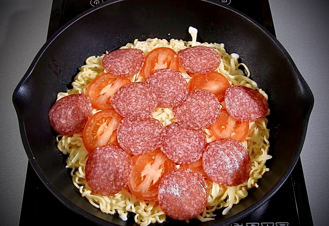Всем привет! Рецепт из рубрики - "Как вкусно скушать доширак". Ингредиенты: Лапша быстрого приготовления - 1 шт. Майонез - 1 ст.л. Кетчуп - 1 ст.л. Яйцо - 1 шт. Помидор - 1 шт. Сыр моцарелла - 180 гр. Колбаса салями - 30 гр.