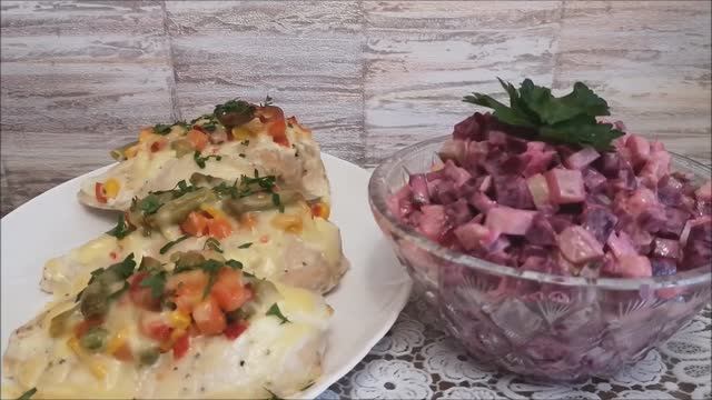VK сообщество: https://vk.com/club225549357 ГОТОВИМ С ЛЮБОВЬЮ на Ютубе!!! https://www.youtube.com/@ГотовимсЛЮБОВЬЮ ГОТОВИМ С ЛЮБОВЬЮ RUTUBE: https://rutube.ru/channel/29858979/ Вкусный ужин. Сочная куриная грудка с овощами. Салат ВДОХНОВЕНИЕ. Быстрый ужин на всю семью куриное филе 3 шт. мексиканская смесь (овощи) 200 гр 2 ст.л. сметаны 100 гр моцареллы соль,перец 2 ст.л. растительного масла запекаем 180°С – 30 минут, добавляем сыр и ещё 10 минут. Салат Вдохновение. отварного картофеля 3 шт. половина луковицы 1 маринованный огурец 2 отварной свеклы домашний майонез,перец,соль