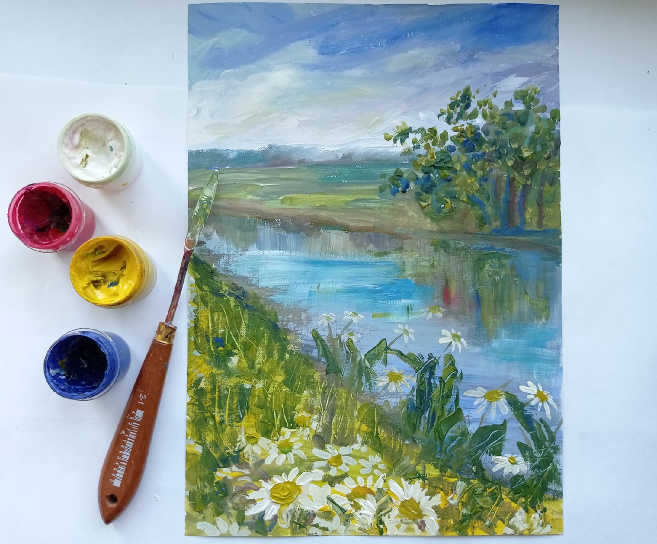 Здравствуйте, мои дорогие творческие друзья! Лето - это прекрасная пора для того, чтобы наслаждаться яркими красками. У меня готов очередной пейзаж, на этот раз с ромашками. Показываю пошагово, как я с помощью гуаши создавала этот пейзаж. Процесс интересный и захватывающий, без ускорения - по заявкам))) Вдохновляйтесь природой, летом, окружающей вас красотой! Рисуйте и пусть вас радует творческий процесс! #позитив_красок #пейзаж_гуашью #гуашь #рисование_пошагово #рисованиегуашью