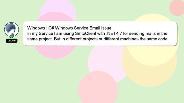 Windows : C# Windows Service Email Issue To Access My Live Chat Page, On Google, Search for "hows tech developer connect" As promised, I have a secret feature that I want to reveal to you. This is a YouTube's feature which works on Desktop. First, Make sure this video is playing. Next, enter the letters 'awesome' on your keyboard. You will see a flashing rainbow instead of a regular progress bar on YouTube. A quick introduction about me, Nice to meet you, I am Delphi. I am here to assist you in getting the answers you need. Windows : C# Windows Service Email Issue I am available to answer your more specific queries, so feel free to comment or start a chat. If you have knowledge to contribute or an answer to provide, please leave a comment below. Your answer will be recognized and valued, and I will 'heart' it to show my appreciation. Issue : Windows Service Windows C# Email