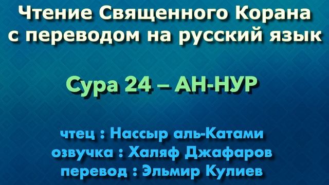 Кира'ат/Чтение с озвучкой Корана Чтец: Насир аль-Катами Озвучка: Халяф Джафаров Перевод: Эльмир Кулиев Источник YouTube канал: " Священный Коран "