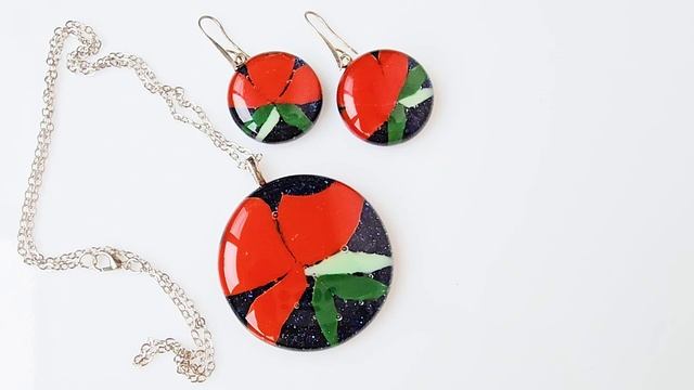 Бижутерия из ювелирного стекла. Крупные женские украшения: Подвеска на шею на цепочке и кругляе серьги с красными цветами на темно-синем искрящемся фоне. Украшения ручной работы сделаны в единственном экземпляре в технике фьюзинг стекла. Несколько слоев цветного стекла запечено в печи при температуре 800 С.