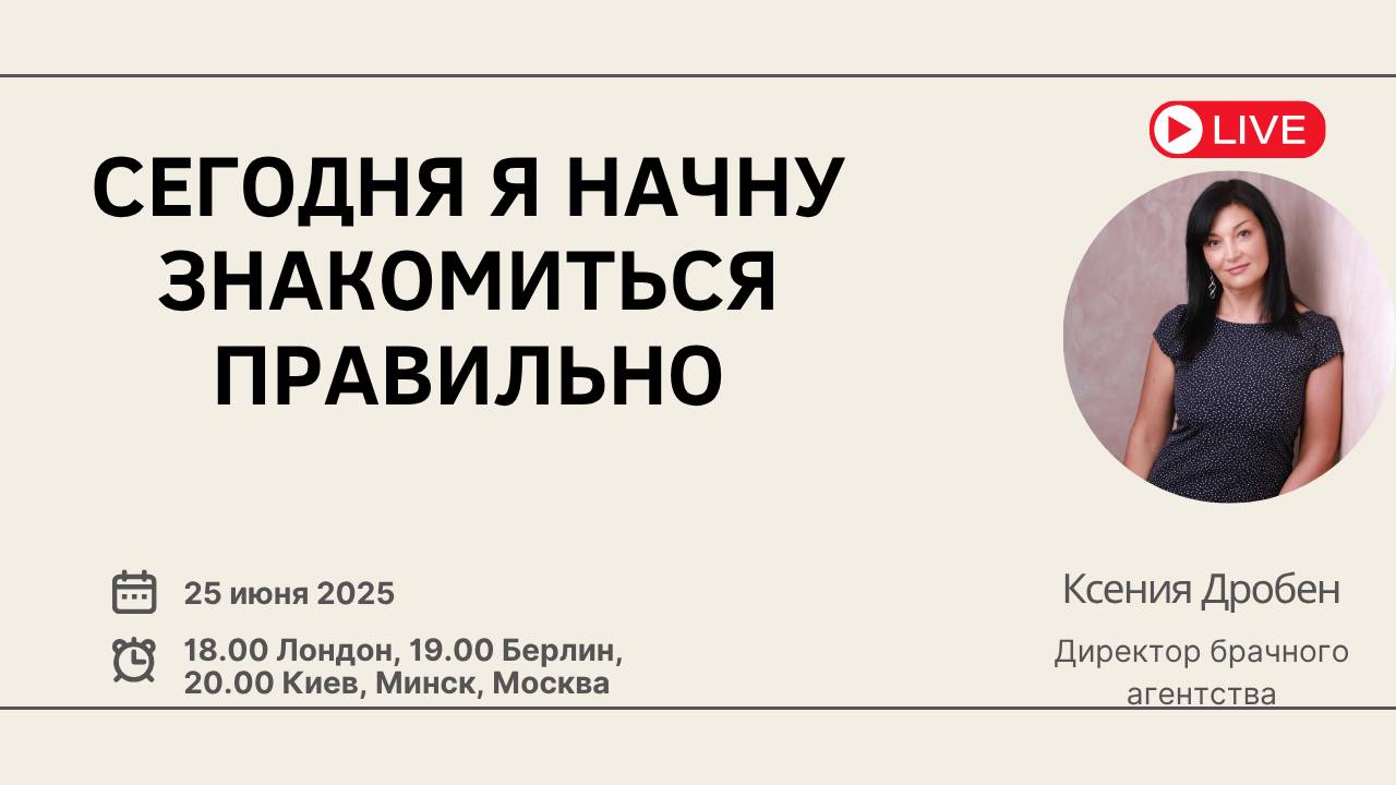 Сегодня у нас среда – день отрытого женского вебинара. Каждую среду мы встречаемся с вами, чтобы поговорить о кавалерах и о любви В прошлый раз мы анализировали Красные флаги в знакомствах. Сегодня поговорим о женских ошибках, которые мы совершаем неосознанно, даже того не замечая. Тема вебинара «Сегодня я начну знакомиться правильно» Когда: среда, 25 июня Время: 18.00 по Лондону, 19.00 по Берлину, 20.00 по Минску, Киеву и Москве Вебинар пройдет: RuTube - https://rutube.ru/channel/24748934/ YouTube Ksenia Droben https://www.youtube.com/@KseniaDrobenPartnervermittlung Страница Facebook https://www.facebook.com/ksenia.droben VK https://vk.com/kseniadroben Instagram https://www.instagram.com/kseniadroben/ - @kseniadroben Tiktok: @kseniadrobendating Если вы не можете принять участие лично, то сможете посмотреть запись на YouTube или RuTube Наши ближайшие мероприятия: 28 июня – Каминная вечеринка в Кельне (Ksenia’s House). Есть 2 места для женщин https://droben-partnervermittlung.de/ru/kaminparty-ru/ 29 июня – Онлайн вечеринка знакомств (перенос с 21.06). https://droben-partnervermittlung.de/ru/dating-event-zoom/ 5 июля – Вечеринка знакомств в Гамбурге. Расскажите подружкам, на наших вечеринках всегда очень весело https://droben-partnervermittlung.de/ru/hamburg-dating-party-ru/ Желаю вам приятного дня, жду на вебинаре вечером С уважением Дробен Ксения www.droben-partnervermittlung.de Whatsapp +4915203663653