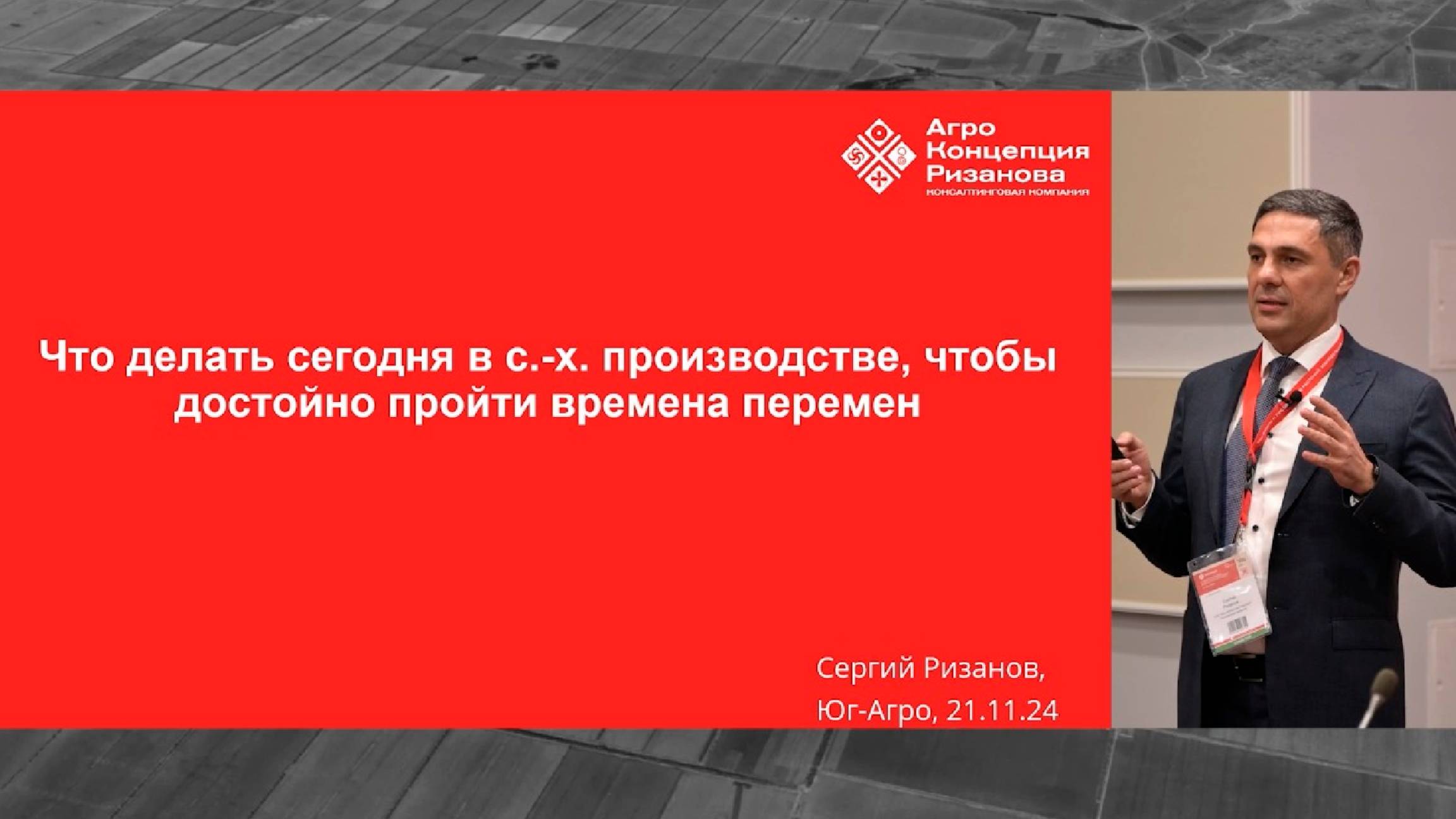 Запись выступления Сергия Ризанова на выставке ЮАГРО 2024 21 ноября. Тема – что делать сегодня в сельхозпроизводстве, чтобы достойно пройти времена перемен? Таймкоды для удобства: 00:01:00 – Программа выступления 00:02:56 – Тренды и что делать 00:04:57 – Миропорядок: старому капут, а нового ещё нет 00:30:59 – Экономика: яма в 2025-2027 01:22:20 – Смена поколений (их меньше и они другие) 01:36:17 – Климат: теплеет 01:37:31 – Потребление меняется 01:39:19 – ИИ снесёт маркетинг д*рьма 10 чек-листов для контроля качества полевых работ: https://agroacr.ru/klyuchevye-pokazateli-kachestva-vypolneniya-polevykh-rabot/ Подписывайтесь на наши соцсети, чтобы оставаться на связи: Телеграм: https://t.me/serhiirizanov ВК: https://vk.com/agroacr Дзен: https://dzen.ru/agroacr Сергий Ризанов – международный эксперт по увеличению чистой прибыли средних и крупных сельхозпредприятий. Наш канал – для руководителей хозяйств, фермеров и студентов аграрных вузов, которые хотят повысить прибыль, снизить риски, узнать больше о современных технологиях производства. #сергийризанов #сельскоехозяйство #агробизнес #земледелие #внесениеудобрений #урожайность #озимаяпшеница #фермерство #farming #югагро #югагро2024