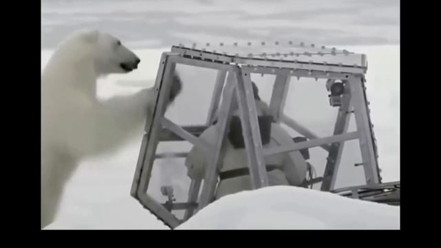 Перевод: «Боже мой. Она огромная. Она — это именно то, ради чего я приехал сюда. Чтобы увидеть этих животных. Понять их. Увидеть их вблизи. Привет... Боже мой. Она прямо здесь. Привет...» «Нюх медведя в тысячи раз сильнее моего. Он собирает информацию, прежде чем приблизиться. Точно так же, как когда выслеживает тюленя. Мой запах сильнее всего в самом слабом месте конструкции. У двери». «Так, дверь прогибается...» «Она методично проверяет клетку со всех сторон». «Находясь так близко... начинаешь по-настоящему осознавать, что это за зверь. Это одно из самых сильных животных на планете. Одно из самых устрашающих животных на планете. И одно из немногих животных, которые действительно воспринимают нас как еду». «Нос привел медведя к щели». «Ты можешь понюхать меня... боже, я на самом деле мог бы дотронуться до её носа». «Она давит... она чувствует, что оргстекло прогибается. Она проверяет, сможет ли она пролезть, сможет ли прокусить его. Здесь становится жутковато. Я чувствую, как она наваливается всем своим весом на стенку...»