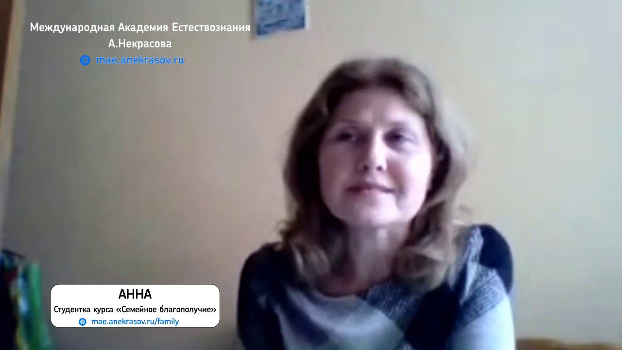 ЗАРЕГИСТРИРОВАТЬСЯ на ближайший набор ЗДЕСЬ: http://mae.anekrasov.ru/family Анна студентка и выпускница курса "Семейное благополучие", 1 набор 2018 года в Международной Академии Естествознания Анатолия Некрасова Сегодня Анатолий Некрасов представляет (http://anekrasov.ru): 1. Писательскую деятельность http://anekrasov.ru/product-category/knigi/ 2. Консультации, коучинг и форсаж http://anekrasov.ru/konsultacii-i-forsazh-s-anatoliem-nekrasovym/ 3. Международная академия естествознания http://mae.anekrasov.ru