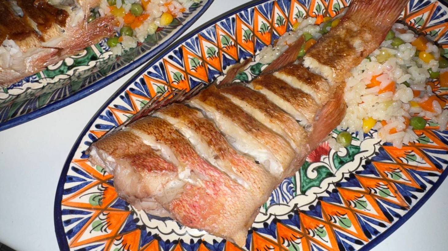 Морской окунь с рисом и овощами.