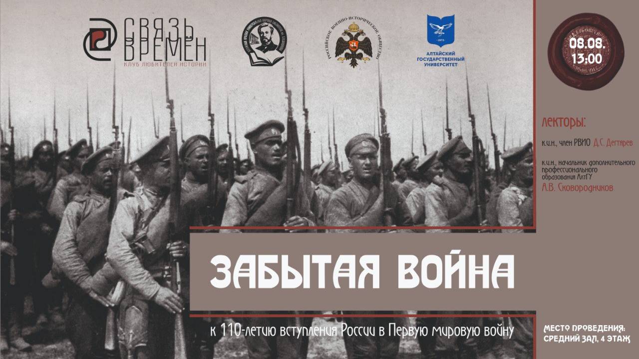 8 августа в Среднем зале (4 этаж, правое крыло) состоится заседание клуба любителей истории Связь Времен на тему «Забытая война: к 110-летию вступления России в Первую мировую войну». Ведущие: к.и.н., член РВИО Д С. Дегтярев и к.и.н. А. В. Сковородников. Первая мировая война, с момента начала которой в августе 2024 г. исполняется 110 лет, является одним из важнейших и определяющих дальнейших ход развития человечества событий XX столетия. Именно это противостояние открыло эпоху войн на уничтожение. Война потребовала тотальной мобилизации всех материальных, экономических, людских и моральных ресурсов населения воюющих стран. Масштабный конфликт изменил все сферы общественной жизни и стал прологом ко Второй мировой войне. Для России участие и досрочный выход из войны означали крушение прежнего общественно-политического строя, затяжную гражданскую войну и становление нового государства во главе с большевиками. О том как Россия вступила в Первую Мировую, основных сражениях и Героях, а также участии наших земляков в этом эпохальном военном конфликте вы узнаете от наших лекторов на заседании клуба любителей истории "Связь времён". Наш сайт: https://akunb.altlib.ru/ Наши социальные сети: ВК: https://vk.com/akunb ОК: https://ok.ru/akunb.altay Телеграм-канал: https://t.me/shishkovka22