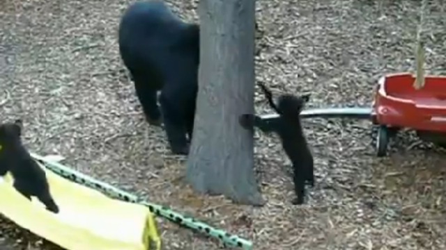 Мама привела своих детишек покататься на горке.