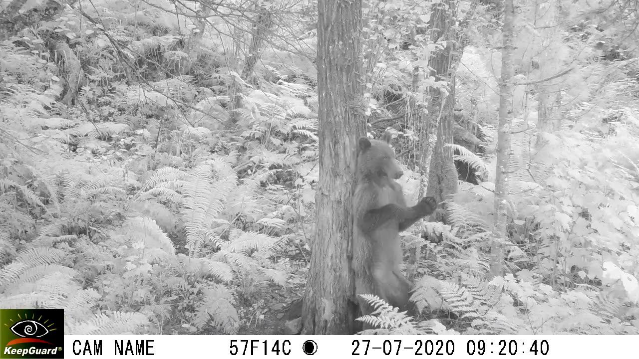 Молодой медведь у маркировочного дерева. В Алтайском заповеднике