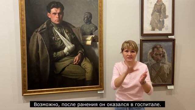 Глухой экскурсовод Татьяна Борисова, участник школы экскурсовода Астраханской картинной галереи, организованной в рамках проекта "Цвет звучащий" - победителя конкурса "Музей 4.0" Благотворительного фонда Владимира Потанина, рассказывает на русском жестовом языке о картине Алексея Штерна "Петербурженка. Разведена. Имеет двоих детей. 4-х и 6-ти лет. Живет в коммуналке", демонстрировавшейся на выставке "Лица эпох. Портрет в собрании Астраханской картинной галереи".