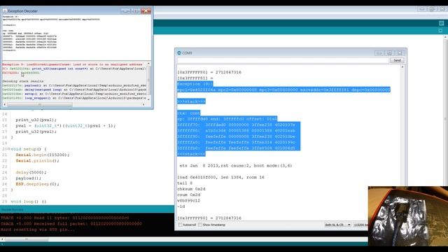 Для поиска источника исключительных ситуаций в коде для ESP8266 можно применять инструмент Exception Decoder, копируя в его окно дамп стека из сериал-монитора. Ссылка на главу документации: https://arduino-esp8266.readthedocs.io/en/2.5.2/Troubleshooting/stack_dump.html Ссылка на саму утилиту: https://github.com/me-no-dev/EspExceptionDecoder PS: извините за звук, пишу на старом ноутбуке, которому тяжеловато сжимать FHD видео налету.