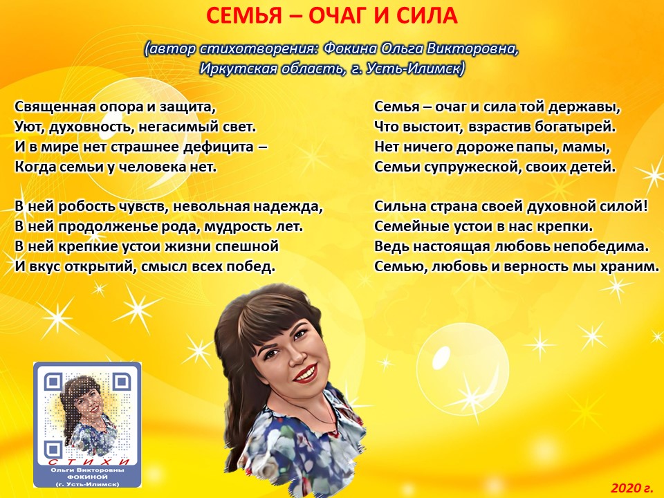Читает автор стихотворения: ФОКИНА ОЛЬГА ВИКТОРОВНА (Иркутская область, город Усть-Илимск) СТИХИ: https://stihi.ru/2018/07/08/3790 БИОГРАФИЯ: http://www.proza.ru/2019/10/08/1473 ВЫИГРЫВАЙТЕ КНИГИ БЕСПЛАТНО: https://proza.ru/2017/09/17/447 ОТЗЫВЫ ЧИТАТЕЛЕЙ: http://www.proza.ru/2019/11/29/611 Из книги Фокиной Ольги Викторовны (Усть-Илимск) «Несу добро в ладошках!»: [все стихотворения с 2005 по октябрь 2020 гг., проза, авторские песни, интервью]. – Москва: МГО Союза писателей России, 2020 г. – 886 стр., ил. ISBN 978-5-7949-0826-8 СЕМЬЯ – ОЧАГ И СИЛА (автор стихотворения: Фокина Ольга Викторовна, Иркутская область, г. Усть-Илимск) Священная опора и защита, Уют, духовность, негасимый свет. И в мире нет страшнее дефицита – Когда семьи у человека нет. В ней робость чувств, невольная надежда, В ней продолженье рода, мудрость лет. В ней крепкие устои жизни спешной И вкус открытий, смысл всех побед. Семья – очаг и сила той державы, Что выстоит, взрастив богатырей. Нет ничего дороже папы, мамы, Семьи супружеской, своих детей. Сильна страна своей духовной силой! Семейные устои в нас крепки. Ведь настоящая любовь непобедима. Семью, любовь и верность мы храним. 8 июля 2020 г.