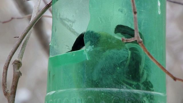 Умная синица устроила себе гнездо прямо в кормушке