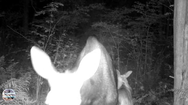 Лосиха с двумя лосятами у солонца в лесу