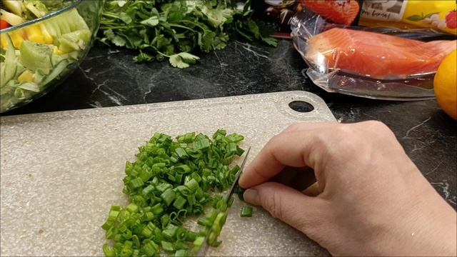 Салат из овощей с киви, форелью и моцареллой. Вкусный сбалансированный ужин.