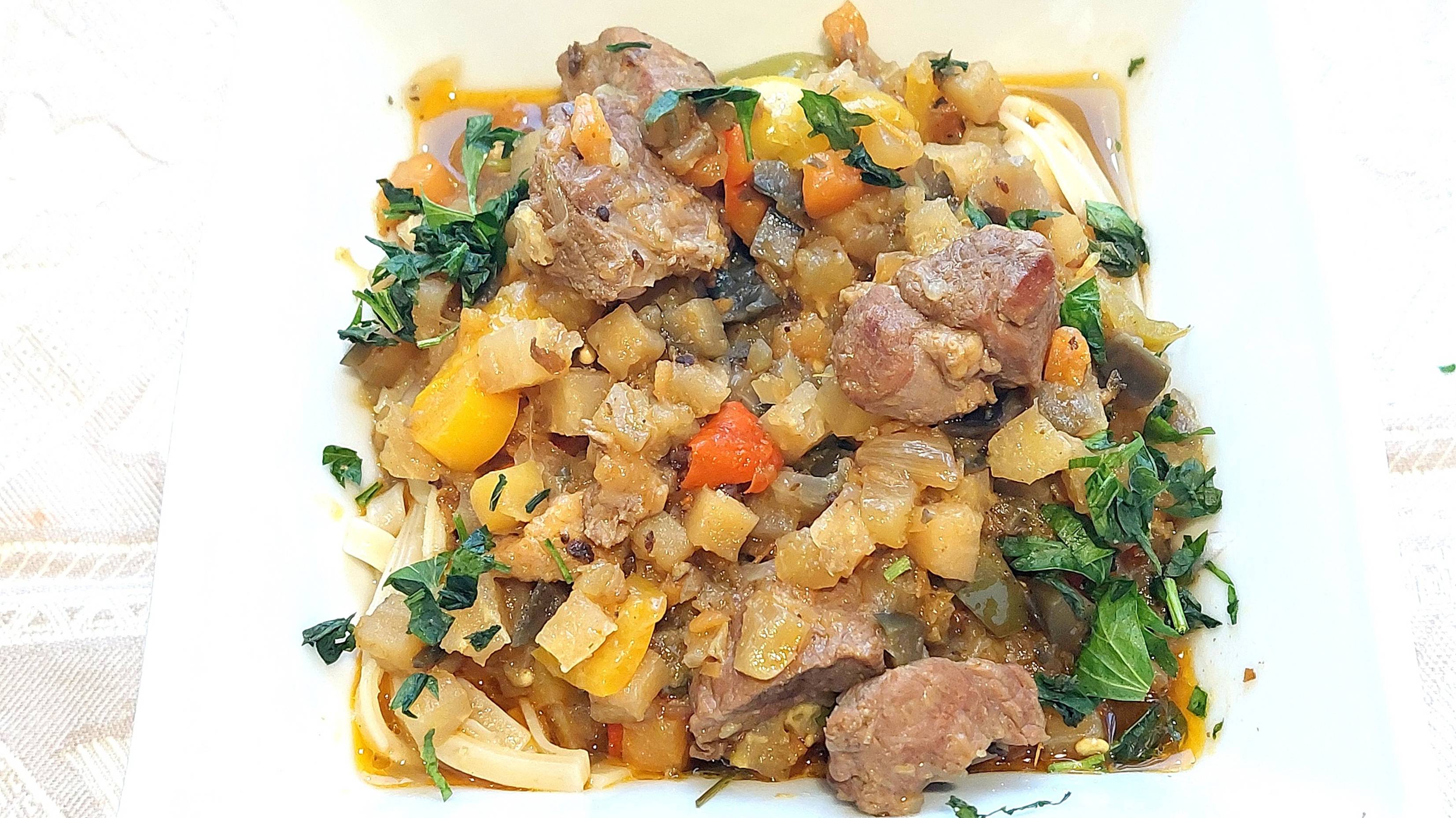 По мотивам лагмана. Наваристое блюдо из баранины, овощей, спагетти (лапши).