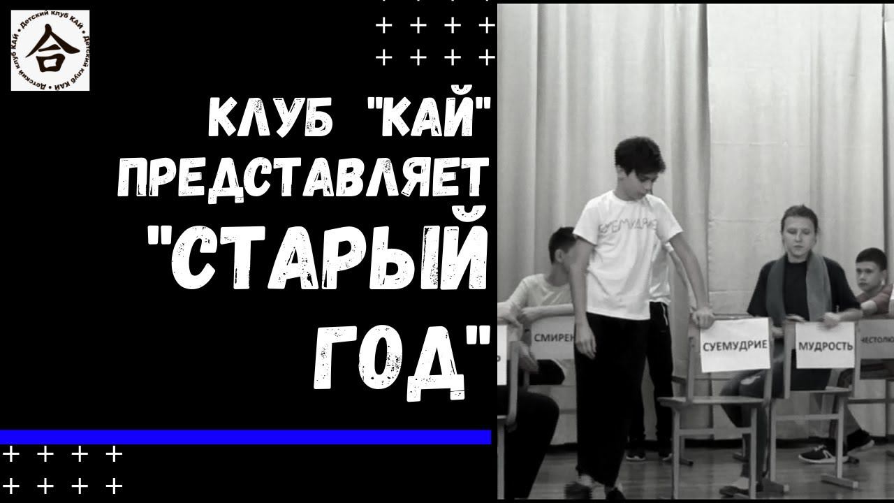 «Старый год» инсценировка сказки М.Горького В ролях Старый год- А.Чмыхов Вечность- И.Коновалов Человеческие свойства: Д.Матвеева, Л.Клеменова, А.Зубков, Е.Галанов, В.Рябинкин, Ю.Цымбалюк, Р.Филюшкин, А.Сидильковский, Г.Тимошенкова, И.Якубов, Т.Гаргаев Руководитель ДК «КАЙ» Черный пояс 2 дан, врач высшей категории, детский хирург Куров Н.В. Старший тренер ДК «КАЙ» Черный пояс 2 дан, педагог-режиссер, детский врач ЛФК Курова О.Н. КАЙ в Фейсбук https://www.facebook.com/ClubKayMoscow Кай в VK https://vk.com/clubkay_moscow Телефон: +7 999 798-02-17 Е-мейл : oksana@klub-kay.ru ПРИГЛАШАЕМ ЮНЫХ АКТЁРОВ В КЛУБ!!!