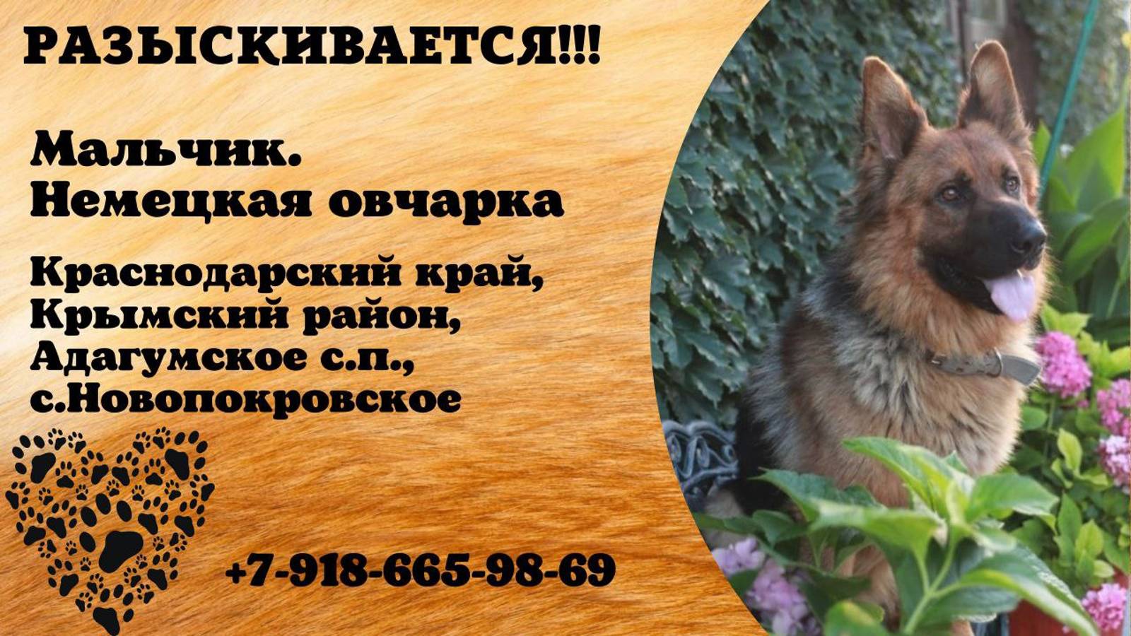 Краснодарский Крымский район Пропала собака Кобель немецкая овчарка. Крупный. Окрас черно-рыжий Кончик языка разрезан. Убежал 4.09 вечером. С. Новопокровское. Крымский район. Адагумское сельское поселение Знает команды (сидеть дай лапу лежать ждать) Обращайтесь по тел. 8918 665 98 69 Наталья пропала Инфо: https://vk.com/wall-198815410_152214