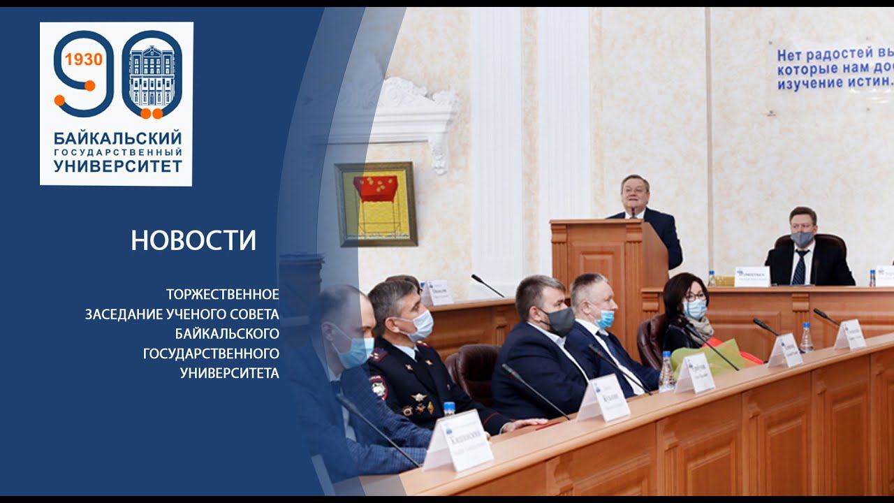 Сегодня 18 декабря 2020 года в 12.00 состоялось торжественное заседание ученого совета, посвященное 90-летию со дня основания Байкальского государственного университета. В зале собрались ученые и преподаватели вуза, представители власти Иркутской области, члены Сибирской Академии наук, ректоры и проректоры высших учебных заведений г. Иркутска, представители иркутских СМИ. С приветственной речью перед присутствующими выступил врио ректора Байкальского университета В.В. Игнатенко (в сокр.): «Уважаемые члены ученого совета, уважаемые гости, уважаемые коллеги! Текущий год юбилейный для нашего университета. Девяносто лет назад – 11 августа 1930 года – Совет народных комиссаров СССР принял постановление о создании в г. Иркутске Сибирского финансово-экономического института. Отнесенный к ведению Министерства финансов СССР, он имел высокий статус наряду с такими финансово-экономическими институтами, как Московский, Ленинградский, Куйбышевский и Казанский. Это был первый и единственный за Уралом финансово-экономический вуз, который начал готовить экономистов и финансистов для Сибири и Дальнего Востока. Пройдя вместе со страной долгий и нелегкий путь своего развития, наш университет превратился из сравнительно небольшого специализированного института в один из крупнейших в Сибири и на Дальнем Востоке образовательных и научных центров с филиалами в Братске, Усть-Илимске и Чите, который в полной мере соответствует всем современным образовательным стандартам и заслуженно имеет статус университета. Сегодня это многопрофильный вуз, осуществляющий подготовку специалистов не только в сфере экономики, управления и юриспруденции, но и социологии, языкознания, психологии, политологии и регионоведения, сельского, лесного и рыбного хозяйства, сервиса и туризма, средств массовой информации, а также по ряду актуальных в настоящее время технических специальностей: информатика и вычислительная техника, прикладная геология, горное дело, нефтегазовое дело и геодезия. Общая численность студентов, обучающихся по всем формам обучения, только в головном вузе составляет порядка 10 тыс. человек. В нашем университете обучаются иностранные студенты из 20 стран. Образовательный процесс осуществляется силами более чем 400 преподавателей, многие из которых – выпускники университета. При этом более 75 % из них имеют ученую степень кандидата или доктора наук, а также ученое звание доцента или профессора. Сегодня мы отдаем дань уважения всем, кто связал свою жизнь с нашим университетом, кто своим честным многолетним трудом способствовал приумножению потенциала вуза и за почти вековой путь способствовал сохранению добрых вузовских традиций. Поздравляю всех работников и студентов БГУ, всех наших выпускников с 90-летним юбилеем университета. Всем желаю крепкого здоровья, благополучия, силы духа, новых творческих высот и достижений, а университету желаю процветания!» Председатель Законодательного Собрания Иркутской области А.В. Ведерников, выпускник БГУ, в своем поздравительном слове с теплотой отозвался о студенческих годах, проведенных в вузе, пошутил, что прошел через вахту по своему магистрантскому пропуску. От имени депутатов Законодательного Собрания поздравил присутствующих и наградил Почетной грамотой Законодательного Собрания Иркутской об