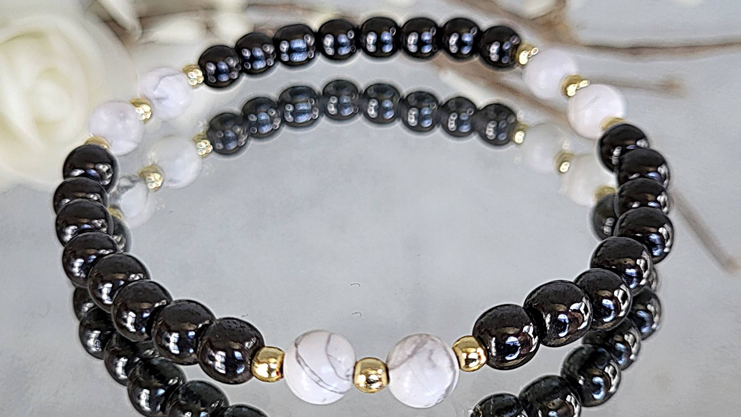 Браслет украшения из натуральных камней. Браслет из кахолонга, гематита: кахолонг шарик 6 мм., гематит шарик 6 мм., гематит шарик 3 мм., длина 19 см. на резинке (на запястье 16-18 см.). Возможно изготовление по вашим размерам.