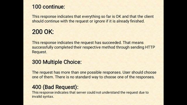 In this video You will learn HTTP status codes and their purpose. They are 100 continue: 200 OK: 300 Multiple Choice: 400 (Bad Request): 404 (Not Found): 500 (Internal Server Error): 505 (HTTP version not supported):