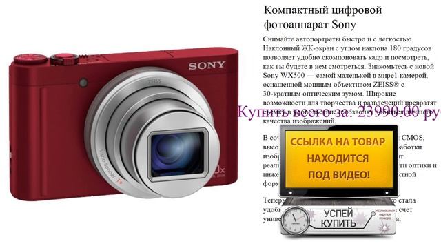Посмотреть товар: http://electronics.urlclub.ru/manicure_and_pedicure_sets/1306141.php Снимайте автопортреты быстро и с легкостью. Наклонный ЖК-экран с углом наклона 180 градусов позволяет удобно скомпоновать кадр и посмотреть, как вы будете в нем смотреться. Знакомьтесь с новой Sony WX500 — самой маленькой в мире1 камерой, оснащенной мощным объективом ZEISS® с 30-кратным оптическим зумом. Широкие возможности для творчества и развлечений превратят съемку в удовольствие и позволят добиться лучшего качества изображений. В сочетании высокоэффективной матрицы CMOS, высокопроизводительного процессора обработки изображения и легендарной оптики находят реализацию новейшие достижения в области оптики и инженерных решений в невероятно компактной форме. Теперь съемка автопортретов и не только стала удобной и простой как никогда раньше за счет универсального наклонного ЖК-монитора, возможностей дополнительной настройки функций и удобным функциям ретуши. Хотите быстро поделиться интересным событием? Сохранить в высоком разрешении и заняться обработкой и монтажом в другой раз? У вас есть свобода творчества. Достаточно просто настроить формат, режим, экспозицию и другие параметры и приступить к съемке.