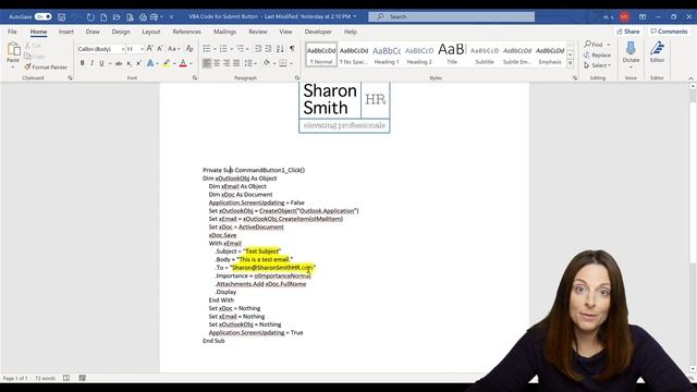 HOW TO INSERT A SUBMIT FORM BUTTON IN WORD THAT SENDS COMPLETED FORMS AS AN EMAIL ATTACHMENT // So you have created a fillable form and now you want to make it easy for your users to send their completed forms back to you. You can accomplish this by including a “Submit” button which is essentially a command button you can insert at the bottom of your form so when the user clicks it, it will automatically open their MS Outlook email client and have an e-mail with your return email address, subject and body text with the completed form attached, so that all they have to do is click “Send.” Here is the VBA code used in this video to create the macro for the Submit command button (be sure to replace the Subject, Body Text and Email address with your own information): Private Sub CommandButton1_Click() Dim xOutlookObj As Object Dim xEmail As Object Dim xDoc As Document Application.ScreenUpdating = False Set xOutlookObj = CreateObject("Outlook.Application") Set xEmail = xOutlookObj.CreateItem(olMailItem) Set xDoc = ActiveDocument xDoc.Save With xEmail .Subject = "Include your own Subject" .Body = "Include your own verbiage for email body text." .To = "youremailaddress@youremail.com" .Importance = olImportanceNormal .Attachments.Add xDoc.FullName .Display End With Set xDoc = Nothing Set xEmail = Nothing Set xOutlookObj = Nothing Application.ScreenUpdating = True End Sub __________ **BE SURE TO WATCH FILLABLE FORMS VIDEO PART 1: https://youtu.be/YktZ3B-tyqs **BE SURE TO WATCH FILLABLE FORMS VIDEO PART 2: https://youtu.be/n_Ni_fj-158 TIP: To ensure the Developer tab is visible in MS Word so you can insert form fields, follow these steps: 1) Right Click on the Ribbon area and select "Customize Ribbon" 2) The Customize Ribbon and Keyboard Shortcuts window opens 3) On the right hand side under "Customize the Ribbon - Main Tab" ensure the "Developer" checkbox is selected, then click OK. __________ FREE DOWNLOADS: ✦ Visit https://mailchi.mp/6a0859ea0844/sharonsmithhrformulasdownload to sign-up for my e-mail list and get FREE downloads of super helpful spreadsheet formulas, dashboards and Org Chart templates for HR professionals. __________ CONNECT WITH ME: Visit my website: https://www.sharonsmithhr.com for more information, tools and resources. LinkedIn: https://www.linkedin.com/in/sharonsmithhr Twitter: https://twitter.com/SharonSmithHR __________ NOTE: If you found this content helpful, please consider donating to my channel from this PayPal link: https://www.paypal.com/cgi-bin/webscr?cmd=_s-xclick&hosted_button_id=AJJ6SXERNDMYA&source=url. Your donation, no matter what amount, is greatly appreciated and goes towards producing content that enhances your productivity and elevates your skills. Thanks for supporting this channel! __________ RESOURCES: ✦ JotForm: https://www.jotform.com/pricing/?utm_source=sharon-smith&utm_campaign=jf1&utm_medium=blog I use clip art and templates from PresenterMedia and I highly recommend them. They have an amazing selection and excellent terms. Here is an affiliate link: https://shareasale.com/r.cfm?b=417324&u=2065055&m=43706&urllink=&afftrack= Some links included here are affiliate links. If you click on these links and make a purchase, I may earn a small commission at no additional cost to you. Thanks for supporting this channel! __________ KEYWORDS: #MSWord, microsoft word tutorial, create fillable forms, fill-in forms, macros, Add a Submit Button to a Form, Create a Submit Form Button in Word, How to Submit Word Form to Email, Add a Command Button in Word, Apply a button to send email with current word form attached, enable developer tab, word productivity tools, Sharon Smith HR, @SharonSmithHR __________ PLAYLISTS: ➤Creating Fillable Forms: https://www.youtube.com/watch?v=YktZ3B-tyqs&list=PLb80efKTbWuOe1LfFMNExEabkRkB5ehcv ➤ Excel Tutorials for HR: https://www.youtube.com/playlist?list=PLb80efKTbWuNjHDGgNeuGrGwOvh4JQC90 ➤ Excel Quickies (Around 2 Minutes): https://www.youtube.com/playlist?list=PLb80efKTbWuPI7fEWtroXHvJHhx5FnVMW ➤ Word Tutorials for HR: https://www.youtube.com/playlist?list=PLb80efKTbWuMotoYEXBFMlB3PtsBlFn45 ➤ Welcome | About Me: https://www.youtube.com/playlist?list=PLb80efKTbWuOd17uW4U2V8Xip0sTAfkLR