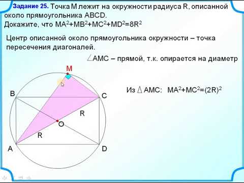 Точка М лежит на окружности радиуса R, описанной около прямоугольника ABCD. Докажите, что МА²+МВ²+МС²+МD²=8R²