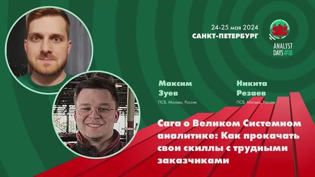 Максим Зуев, Никита Резаев В докладе мы, на основе реальных кейсов, расскажем о работе с противоречивыми бизнес-требованиями или их отсутствием. Разберём влияние психотипов заказчиков на горизонтальный рост системного аналитика. Мы ответим на такие вопросы: 1. Как системному аналитику работать в одиночку, когда заказчик минимально вовлечён в процесс разработки цифрового продукта? 2. Возможно ли системному аналитику работать вообще без заказчика? 3. Является ли развитие системного аналитика в горизонтальной плоскости приговором? Доклад будет полезен для тех, кто работает со сложными заказчиками и стремится прокачать свои навыки в горизонтальной плоскости.
