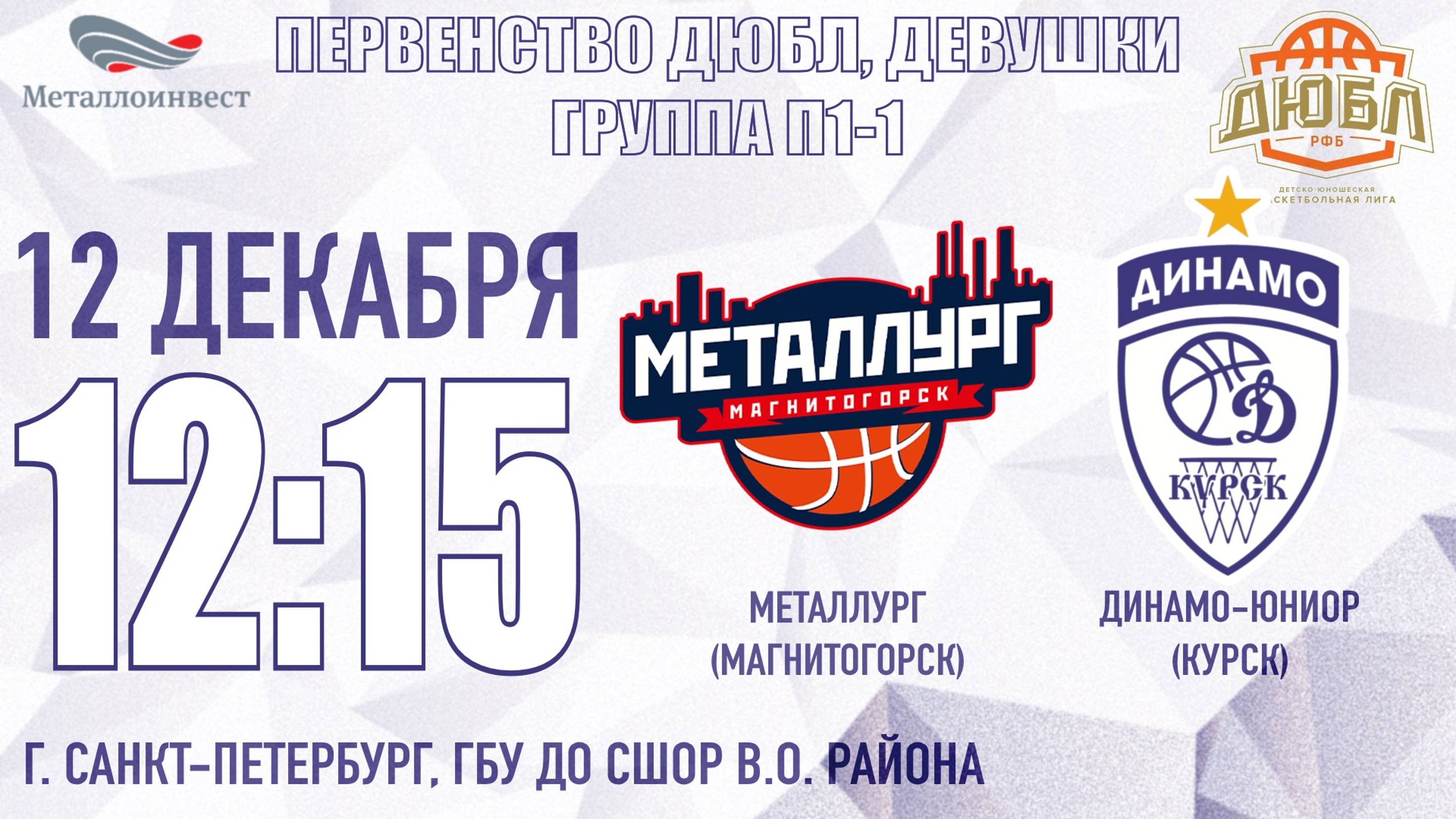 12.12.2024 12:15 Металлург (Магнитогорск) - Динамо-Юниор (Курск) Первенство ДЮБЛ Девушки, Группа П1-1 | Санкт-Петербург | 08.12-13.12.2024 Арена: Санкт-Петербург, ГБУ ДО СШОР В.О. района Статистика: https://russiabasket.ru/games/866411?apiUrl=https://org.infobasket.su&lang=ru