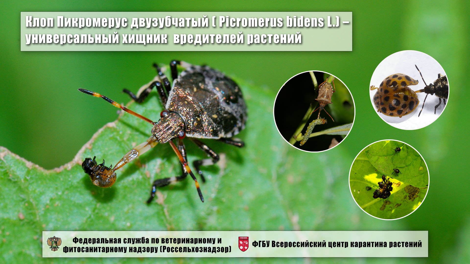 Впервые в полевых условиях Приморья Всероссийский центр карантина растений проводит эксперимент по биометоду. На картофельные поля высажено насекомое-энтомофаг - клоп пикромерус двузубчатый, Picromerus bidens L.(Hemiptera, Petatomidae). Это универсальный хищник более 250 видов вредителей растений. В Приморье, возле г. Уссурийск, энтомофаг будет бороться с карантинным вредителем - 28 точечной картофельной коровкой, Epilachna vigintioctomaculata Motschulsky. 2018 год - подготовительный, в целом, эксперимент продлится 3 года.