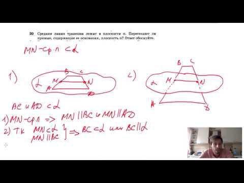 №20. Средняя линия трапеции лежит в плоскости α. Пересекают ли прямые, содержащие основания трапеции, плоскость α? Ответ обоснуйте. Мой второй канал для подготовки к ЕГЭ и ОГЭ - https://www.youtube.com/ЕвгенийСумин Инстаграм - https://www.instagram.com/EGE_OGE.math Личный инстаграм - https://www.instagram.com/ee_sumin VK - https://vk.com/evgeniysumin FB - https://www.facebook.com/EvgeniySumin