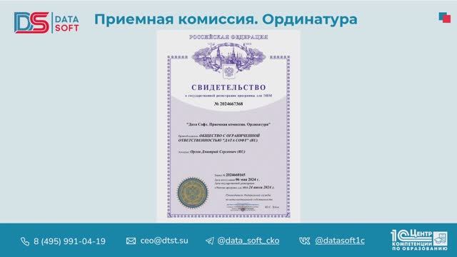 Дата получения: 6 мая 2024 Номер патента: 2024667368 Усовершенствованы механизмы проведения приемной кампании Ординатуры: в дополнительной обработке по интеграции с ЕИСПО реализована функция формирования файлов для загрузки данных в систему в соответствии с установленными форматами. Данная обработка обеспечивает обмен и загрузку информации согласно правилам ЕИСПО: прием заявлений, отзыв заявлений, сведения о вступительных испытаниях и итогах приемной кампании, запросы на получение результатов вступительных испытаний и загрузку окончательных результатов испытаний. Документ «Аккредитация» аккумулирует данные о вступительных испытаниях абитуриентов, желающих поступить в ординатуру. Этот документ представлен в виде отдельной вкладки как в анкете, так и в карточке абитуриента, а также существует как отдельный справочник в разделе «Работа с заявлениями абитуриента». Таким образом, система становится более эффективной.
