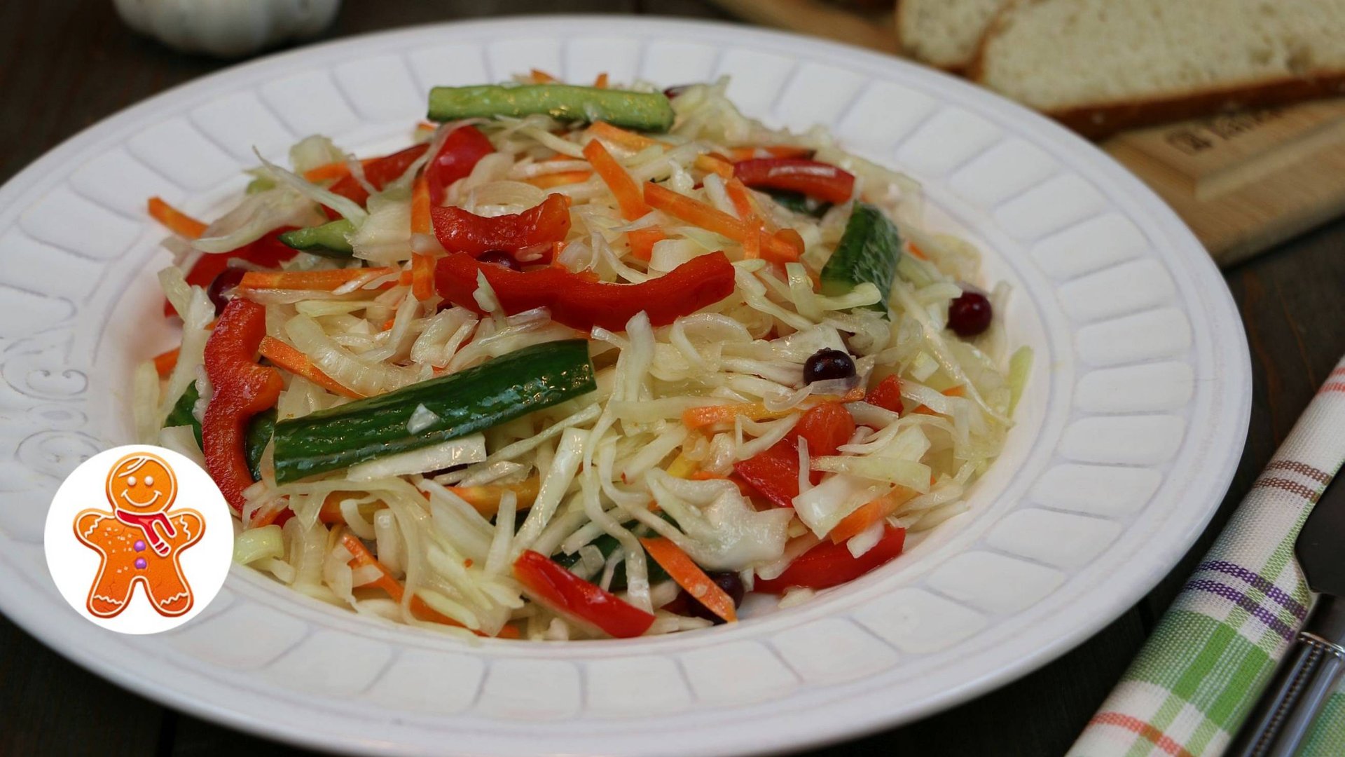 1 кг белокочанной капусты 2 средние моркови 1 крупный болгарский перец 2 средние луковицы 2 свежих огурца горсть брусники или клюквы 1 ст. ложка соли 2 ст. ложки с горкой сахара 80 мл растительного масла 80 мл уксуса 9% красный острый перец
